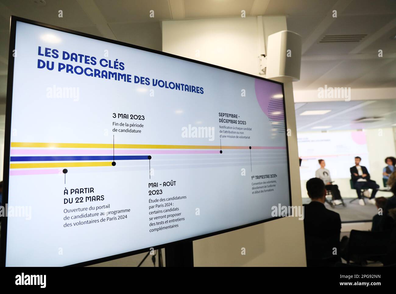 230321 SAINT DENIS, March 21, 2023 A TV screen shows the